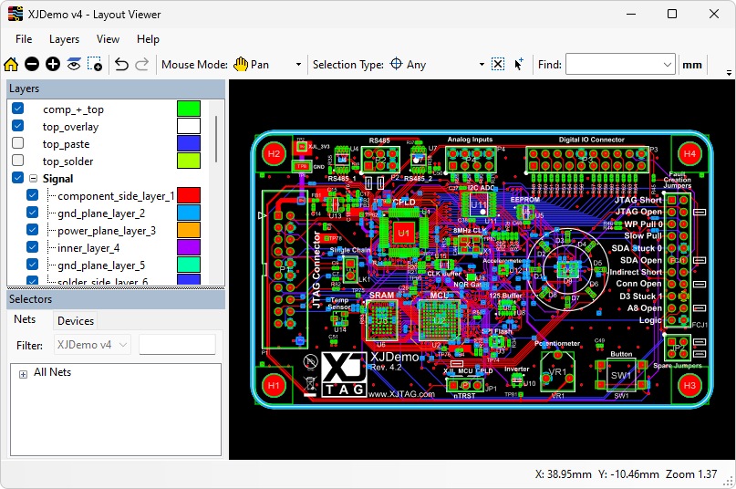 The Layout Viewer standalone application can be opened directly from the command-line, using the path to an ODB++ project as an argument. The Layout Viewer 4.2 (LayoutApplication.exe) is typically installed to C:\Program Files\XJTAG 4.2\Bin.