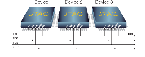 The data path emerges from each device in the chain at the TDO pin, which is then connected to the TDI pin of the following device. The TDO pin of the final device is connected back to the TDO pin of the JTAG controller to complete the data path.