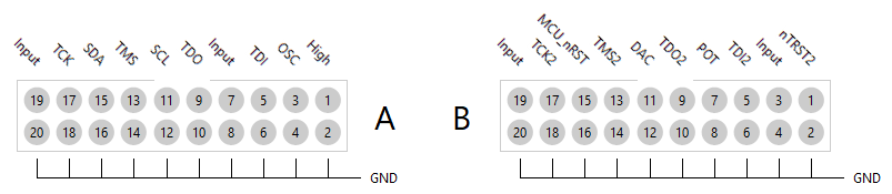 The XJLink-PF40 has a configurable pin-out, using the odd-numbered pins of its connectors. The even-numbered pins are connected to GND.