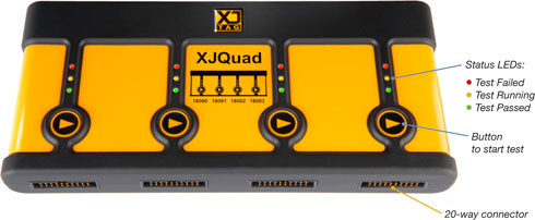Each port of the XJQuad has its own set of status LEDs to indicate that tests have passed (green), failed (red) or are running (flashing yellow), to allow the status of the attached units to be clearly seen.