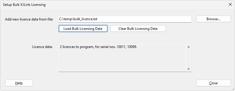 Bulk Licensing... button in the XJLink manager's main window launches the Setup Bulk XJLink Licensing dialog, allows you to load into the XJLink manager and then licence the XJLink units automatically as they are plugged into the PC.