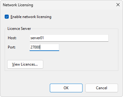 If network licensing has been enabled, when you click OK the server is contacted to verify that the details are correct. You can also click the View Licences button to display the licences available on the server and who has them checked out.