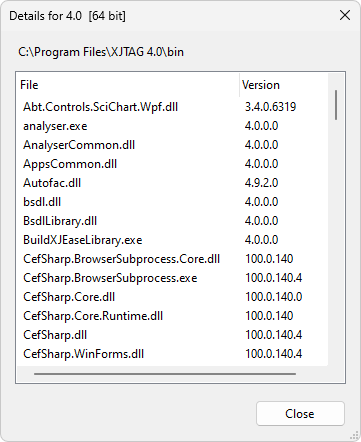 Selecting an installation, and clicking Details... displays a list of all the XJTAG binaries and their file versions. Any anomalies are displayed in red.