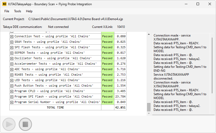 To the right of the test output panel information is displayed about the DDE communication between XJTAGTakayaApp and the Takaya software.