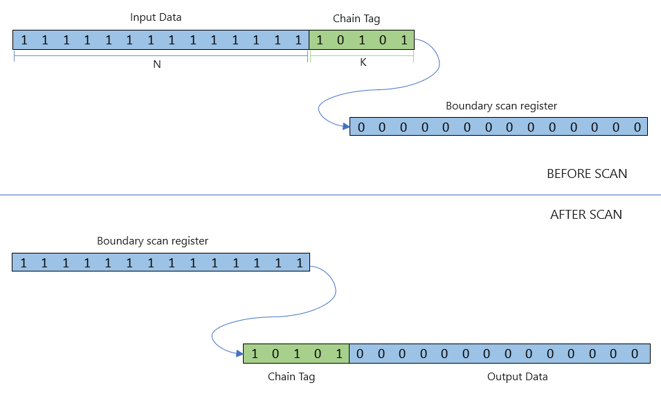 Looking at the figure above, the JTAG chain contains N zeros before the scan, which are the bits that we need to read. The new chain contains all '1's, and we tag our K test bits (the chain tag) onto the start of the chain. We clock N+K bits into the JTAG chain and read N+K bits out, which includes the returned JTAG chain and the chain tag. The tag is then checked to make sure that the boundary scan register is complete (and is the correct length).