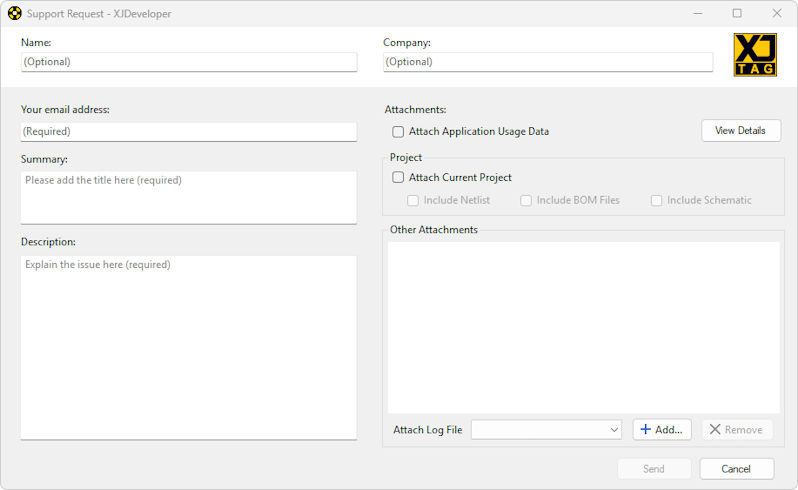 Attaching a project is done by checking the Attach Current Project checkbox, (this may say Attach XJPack File in apps where you only have an XJPack file to attach). The Include Netlist checkbox is tied to the Project checkbox, as this is required to send us a project. The Include BOM Files and Include Schematic are optional fields.