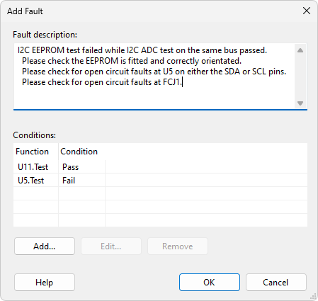 - Select the Add button again to enter another condition. This time select the test function for U5 under EEPROM Tests, and set the condition to Fail.