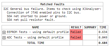 Run Tests screen of XJDeveloper to test products in volume, you are likely to find over time that there are certain common fault conditions that require known remedial action. In order to reduce repair time, you can configure a Fault Dictionary in your XJTAG system to recognise these fault conditions and display a message describing the required repair, or additional tests that should be performed.