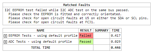 I2C EEPROM test failed while I2C ADC test on the same bus passed. Please check the EEPROM is fitted and correctly orientated. Please check for open circuit faults at U5 on either the SDA or SCL pins. Please check for open circuit faults at FCJ1.