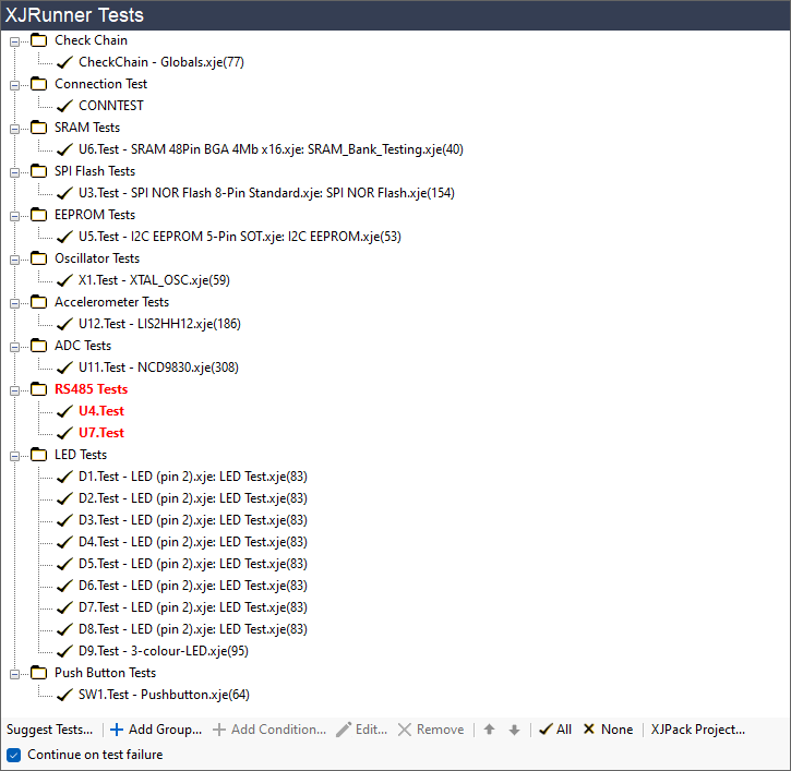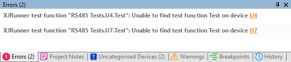 These errors are because XJTAG cannot find the Test Function it was using in the Test Device File for the two RS485 transceivers U4 and U7. This is because now that we have reassigned the transceivers the Test Device File is no longer associated with U4 or U7. With our new logic definition, XJTAG can automatically test U4 and U7 by verifying that each logic input state produces the correct output. This will be done by the Connection Test, and so there is no longer any need for the XJEase tests that were previously used - they can simply be removed from the test list.