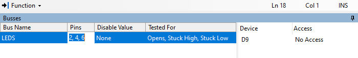 Busses in XJEase files are listed with the most-significant bit (MSB) listed first, and LSB last. This is not important for this LED test, but generally on devices with multi-pin busses (e.g. ADDRESS or DATA) you should set this up correctly, because generated fault reports will include this information.
