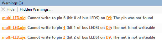 - Inspect the Warnings pane in XJDeveloper. There will be three new warnings shown, warning that pins 2 and 4 of device D9 are not writeable during tests, and that pin 6 is not found. This is because of the mismatch between the newly assigned file and the design of the XJDemo v4 board.
