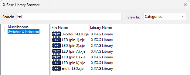 On the XJDemo v4 board, D9 is a 3-colour LED (containing a red LED and a green LED; the third colour is obtained when both LEDs are lit), and is tested using the 3-colour-LED.xje file. In this exercise we will change this to use an alternative file from XJTAG's XJEase library: multi-LED.xje. However, the pins in this alternative file do not match up with those of the device used on the XJDemo board, and so some adjustments are needed.