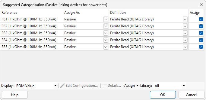 - Assign will already be selected for all 5 of the suggested ferrite beads, as shown in the image below, so just click OK.