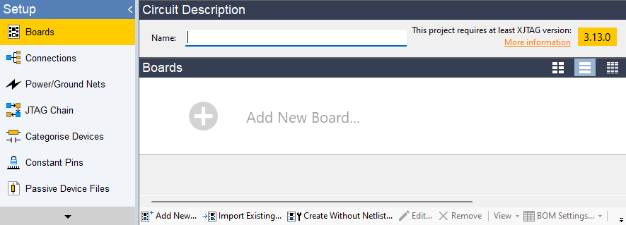 This opens automatically when a new project is created, or can be launched manually either by clicking the Add New Board... tile in the main area of the Boards screen, or by clicking the Add New... button at the bottom of the Boards screen: