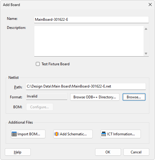 XJDeveloper will automatically attempt to identify the format of netlist being used. Over eighty different ASCII formats are supported, including P-CAD®, Protel, Board Station®, PADS® PCB, RINF, and IPC-356-D. If the netlist is not recognized, this will be indicated by the software listing the format as "Invalid" in the Add Boards dialog box: