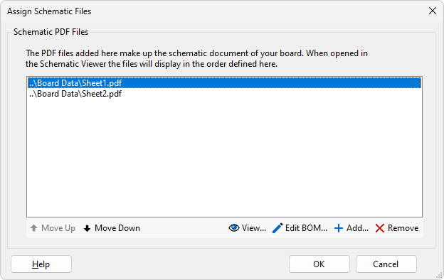 Once the schematics have been selected, the Assign Schematic Files dialog box will appear (Figure 6 below), which will display the chosen filename(s). Further PDF files can be added using the Add... button: