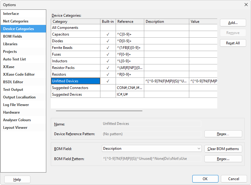 To set the required regex, click Unfitted Rules... in the Boards screen to bring up the Unfitted Suggestion Rules dialog. The checkbox labelled Device matches to any other BOM field patterns of the unfitted category should be ticked.