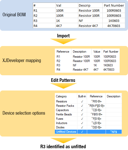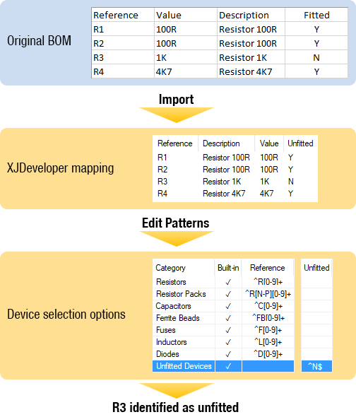 The method used for identifying unfitted devices will depend on how the user's BOM is structured. In this section, three examples are given to describe how to deal with different scenarios.