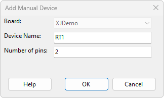 When creating an additional device, the Device Name is the effective circuit reference for the device and hence must be unique on the board - XJDeveloper will prevent you from creating a new device with a name which has already been used. Specify the number of pins that the device has and then click OK to save.