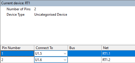 This will populate the right panel with the device information. Fill in the Connect To column to specify how each pin on the manual device connects to the board. As usual, as you type into the field, you will be shown any devices or pins that fit what you have typed. The dropdown list will also show the net that the matched pin is connected to, allowing you to ensure you have the correct pin, and to click on it to select it if you wish. Once all the pins are configured, click Apply to save your changes. If you don't click