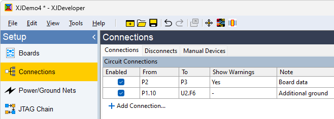 The Connections screen allows you to tell XJTAG about changes to connectivity in your circuit that aren't covered in the netlist. This can be split into three different categories: