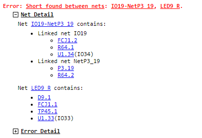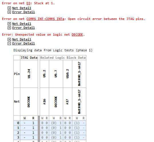 Investigating shorts and opens can be done directly from the errors on the Run Tests screen, by expanding the error details as shown in Figure 3, or by right-clicking on the nets involved to find them in the schematic or layout and then investigating them on the PCB. Additionally, expanding the Net Detail will, for an open, attempt to show which accessible pins are on each side of the break. Typically, shorted nets will be shorted where the two nets are at adjacent pins on a device; this is likely to be where the fault has happened, perhaps from a solder bridge. The layout viewer is useful to show where nets have pins, vias or connections close to each other where a short might occur.