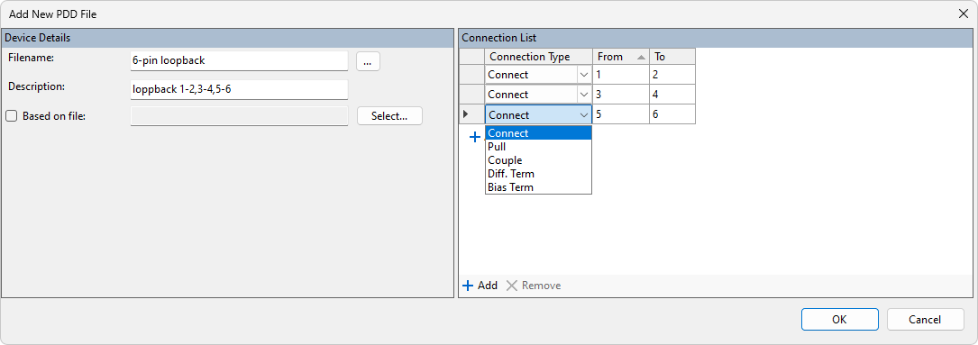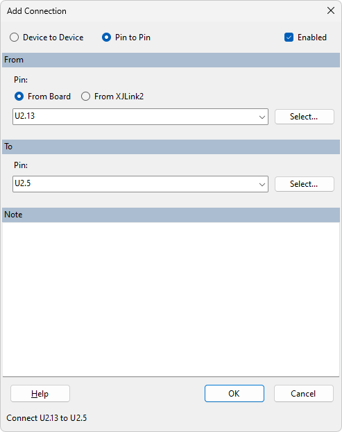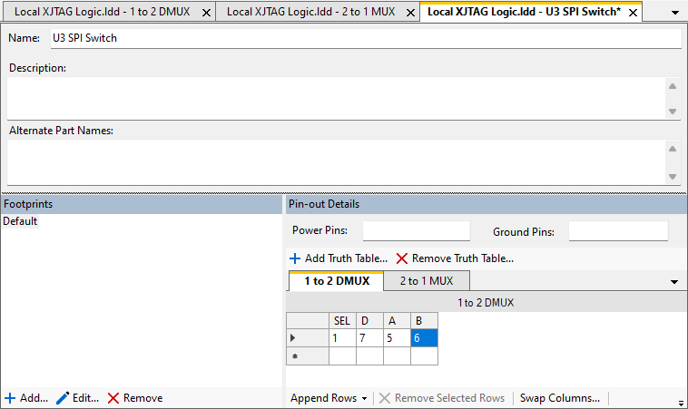 and then repeat the process for the other A-B pairs. Once they have all been added, click to create the new PDD file.Note that this approach results in no test coverage on U2's Output Enable because a Constant pin is needed to hold it in a fixed state to allow Connection Test to run correctly. For the Output Enable pin to be tested, U2 would need to be categorised as Logic, with a truth table that includes the pin. However, in that case, a test function cannot be run on the QSPI device because XJDeveloper would not understand how to read U3's data lines because connecting via a (unidirectional) logic device would prevent an output from U3 reaching the JTAG device.