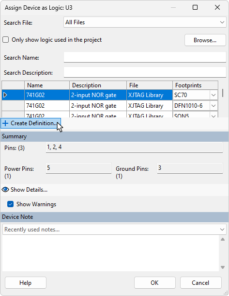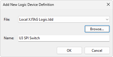 This opens the Add New Logic Device Definition dialog, in which you will need to provide a suitable name for the logic definition. In this example, the definition will be unique to this circuit, and a clear circuit-specific name such as U3 SPI MUX should therefore be used. The system also needs to know in which file to enter the new logic definition. This will normally be Local XJTAG Logic.ldd, which is automatically created the first time a Logic Device Definition file is used: