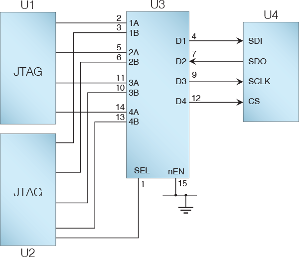 - When the data flow through the switch is bidirectional, and the switch is used to connect a device to one of several JTAG devices.