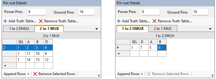 With both truth tables added, the next stage is to provide the device's pin-out as shown in Figure 70 below. In the tab for the Logic Device file, provide a description and type the pin numbers directly into the cells. To switch between its two truth tables, select the relevant tab: