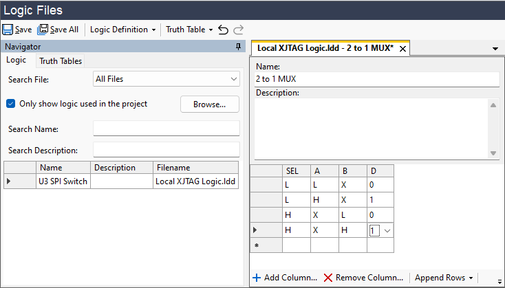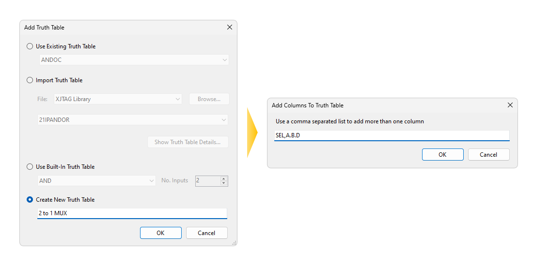 radio button and provide a name. It is best if this is generic to aid reuse: for example,Click Add Columns to Truth Table dialog. In this example, you will want four columns – three inputs (SEL, A, and B) and one output (D). Enter these headings separated with commas and click :