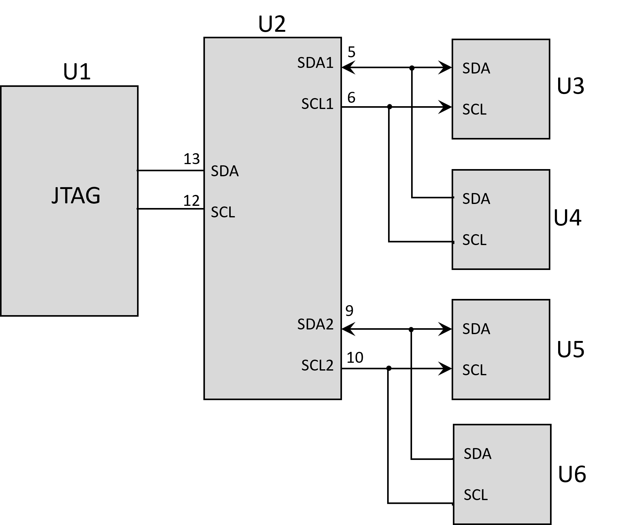 - When an I2C Multiplexer connects a JTAG device to I2C devices on different output channels.