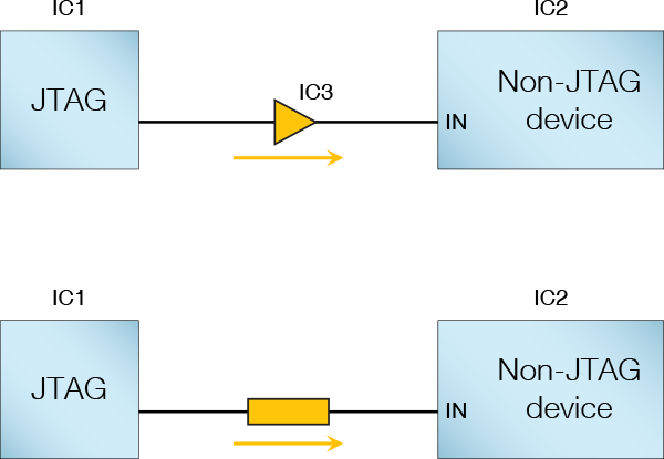 For example, consider a non-inverting buffer: the only difference to a series resistor in terms of how the digital value passes through it is that the signal path is unidirectional instead of bidirectional. However, in some circuit configurations, the signal flow through a series resistor may also only ever be unidirectional, such as when it's in the MOSI signal path of a SPI bus. In those situations, it can be appropriate to categorise a logic gate as Passive. Compare the signal flow in the two circuits of Figure 56. In the upper circuit, a buffer, IC3, connects a JTAG device to the input pin of a non-JTAG device. During boundary scan testing, the signal direction in the upper circuit can only be from IC1 to IC2. Similarly, in the bottom circuit, because the pin on IC2 is an input, the signal flow can only be from left to right, towards the non-JTAG device's input pin. Because the behaviour is the same for both circuits, it is valid to categorise IC3 as if it was a passive device as part of the process of simplifying complex logic.