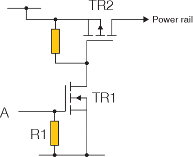 In the circuit of Figure 54 above, a test on TR1 may also be able to check R1 for open circuits. Provided the output supply rail decays fast enough after being switched off, a test could be written that turns TR1 on and checks the power rail is present; and then sets the JTAG pin driving the gate to high impedance and confirms the pull-down effect of R1 has switched power off.