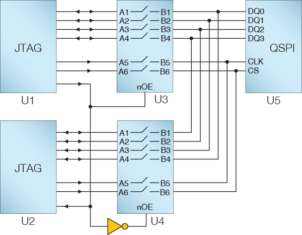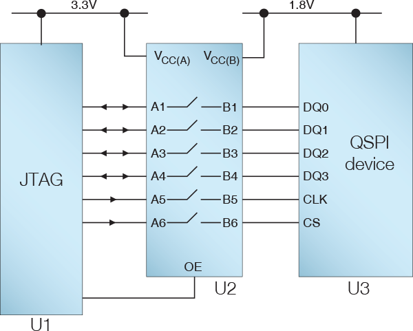 - When the data flow through the switch is bidirectional, such as when a JTAG device connects to a QSPI peripheral through a simple voltage-translating switch.