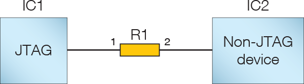 For example, in the circuit of Figure 7 below, before R1 is categorised, there will only be JTAG access to pin 1 of R1. However, once R1 is categorised as a series resistor, there will also be access to IC2 because XJDeveloper then understands the connectivity provided by the resistor.