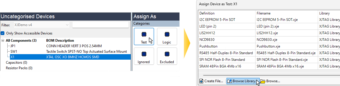 If a suitable file exists, the device can be categorised as shown in the Categorising Test Devices section. If an XJEase file does not exist, close the library browser to return to the Assign Device as Test dialog. A new test device file can then be created (or an existing one modified) as described in the user guide chapter on Creating Test Device Files.