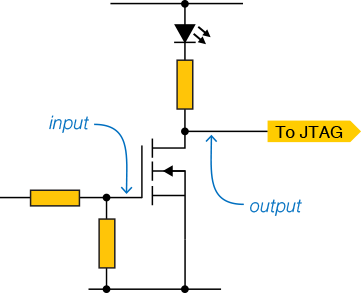 However, if there is no pull-resistor, BUFOC and INVOC cannot be used because the system will not understand how to change the output between both states and will therefore consider the net untestable. For example, consider the circuit of Figure 42 below, where the transistor is providing a signal for a JTAG device, but an LED is used in place of a pull-up resistor. In that situation, the diode would be categorised as a test device rather than a pull-up, and the output net would therefore not have a known state when the FET is off. As a result, using the BUFOC or INVOC logic table for the transistor would be wrong because the system would then believe it had no way to set the output net high.