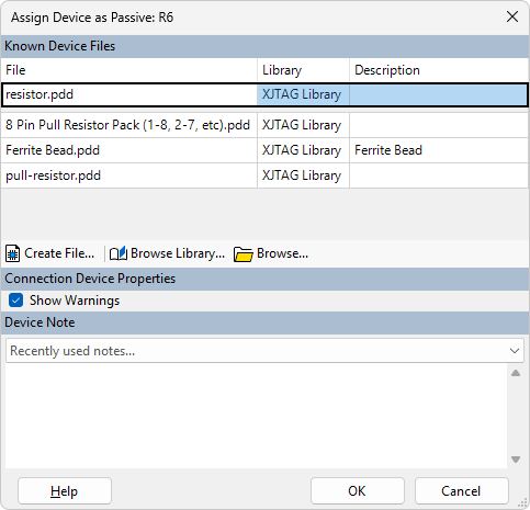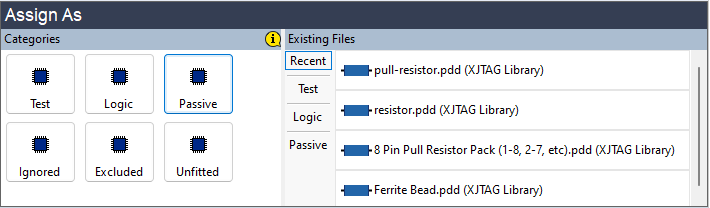 When not using the Recent list, device categorisation will be done in the Assign Device as Passive dialog as shown in Figure 11 below. XJDeveloper's suggested file is shown above the grey bar, and files previously used in the project are shown below it.