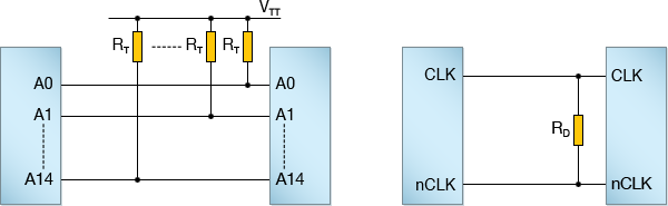 Bias Termination Resistors: in the first example, each address line is terminated using a resistor that connects to a fixed voltage, VTT (frequently mid-rail). This arrangement is often used around DDR memories.