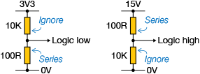 In the first example, the divider's output voltage is a valid logic low. The 2K2 resistor should therefore be categorised using the Pull Connection Type and the 10K as an Ignored device. In the second example, the output voltage is a valid logic high and so, this time, it's the upper resistor that is categorised as Pull and the lower one is set to Ignored. In example 3, neither resistor pulls the output to a valid logic state, so the potential divider's resistors cannot be tested: both need to be set as Ignored devices.