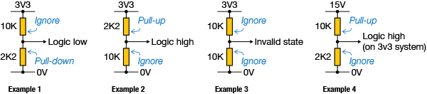 Example 4 shows a similar configuration to the first one, except that the resistors divide down from a higher voltage. The output voltage now gives a logic high for a 3V3 system and so, if the JTAG device reading it is operating at 3V3, the configuration is similar to a pull-up: this time, the 10K should be assigned as the Pull and the 2K2 as an Ignored device.