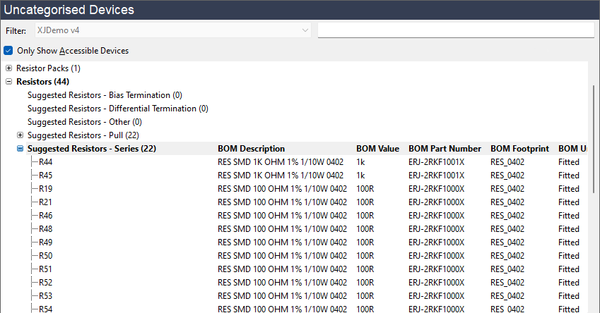 The next step is to assign the series resistors. XJDeveloper will suggest resistors for this category if they're not connected to power or ground and their value is below 100 kΩ (when value data is available in the BOM).