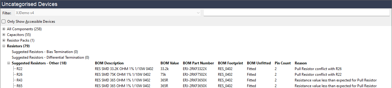 - Resistor categorisation is simplified by having resistor values available. It is therefore recommended that BOM data is imported. If XJDeveloper does not have this information, more manual checking will be required.