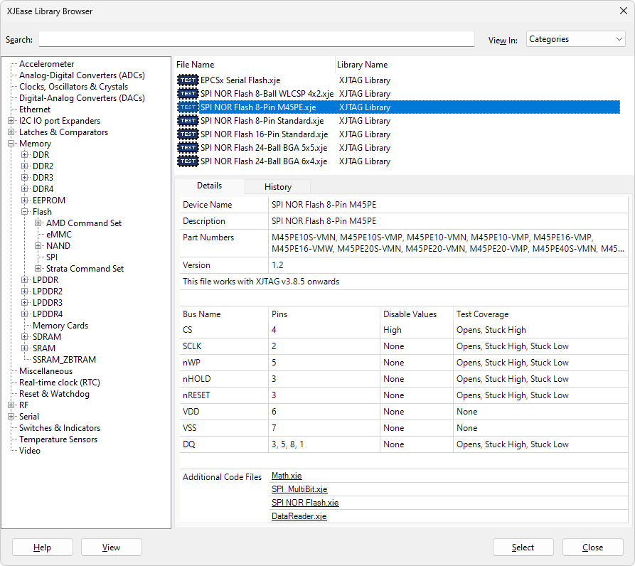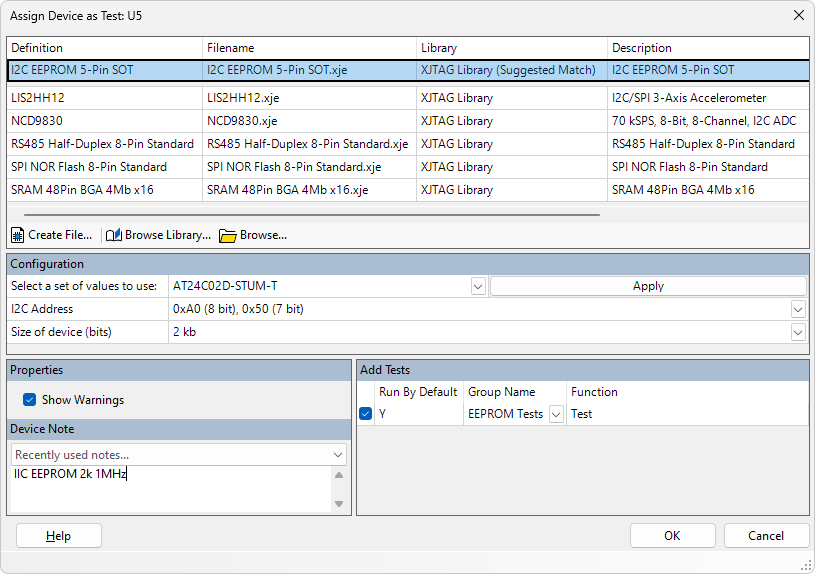 Devices that will be tested or controlled using an XJEase function are described as Test Devices. They range from simple components such as LEDs and push buttons to ICs such as memories, ADCs, accelerometers, etc. When categorising a device as Test, a test device file must be assigned. This file can contain XJEase code as well as providing information about the device's pins.
