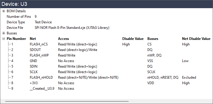 - The Net Disable Value and Disable Value columns show any access restrictions applied to the nets during a connection test. Although you may wish to confirm that these disable values are the expected default values for the nets, they will not affect your ability to test the device using XJEase because functions in the test device file can override them.