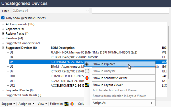 If Explorer shows the expected level of access isn't being achieved, you can use Explorer to navigate through the different signal paths to see what is causing the problem. A net could be suffering reduced access because it's thought to be connected to power or because there's a device connected to it that hasn't yet been categorised. A net will show No Access if it connects to a power or ground rail, so if a signal net is shown as No Access, it might be because a pull-resistor has accidentally been categorised as a series resistor. If a net is marked as Excluded, that can indicate that a pin of an uncategorised device is on the net.