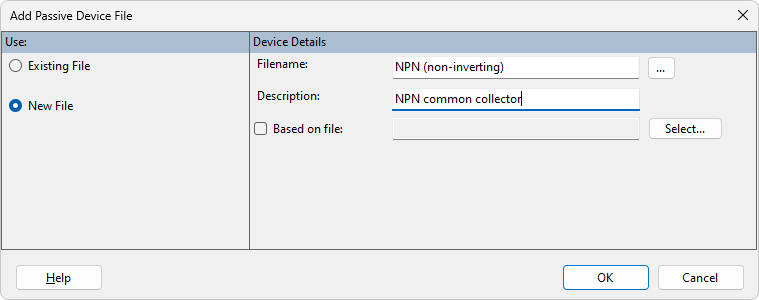 If a similar file already exists, it can be used as the basis for the new one. In that case, select the Based on file checkbox and click Select... to choose an existing passive device description file.