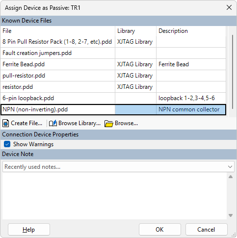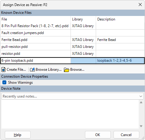 Having clicked OK, you will be returned to the Assign Device as Passive dialog, and the new file will be shown in the list of Known Device Files: